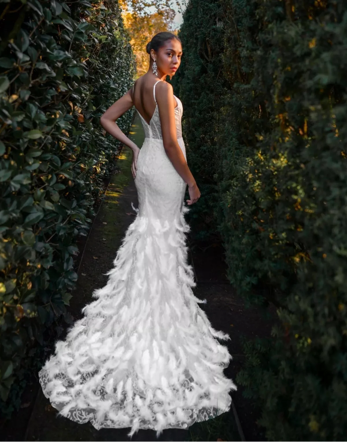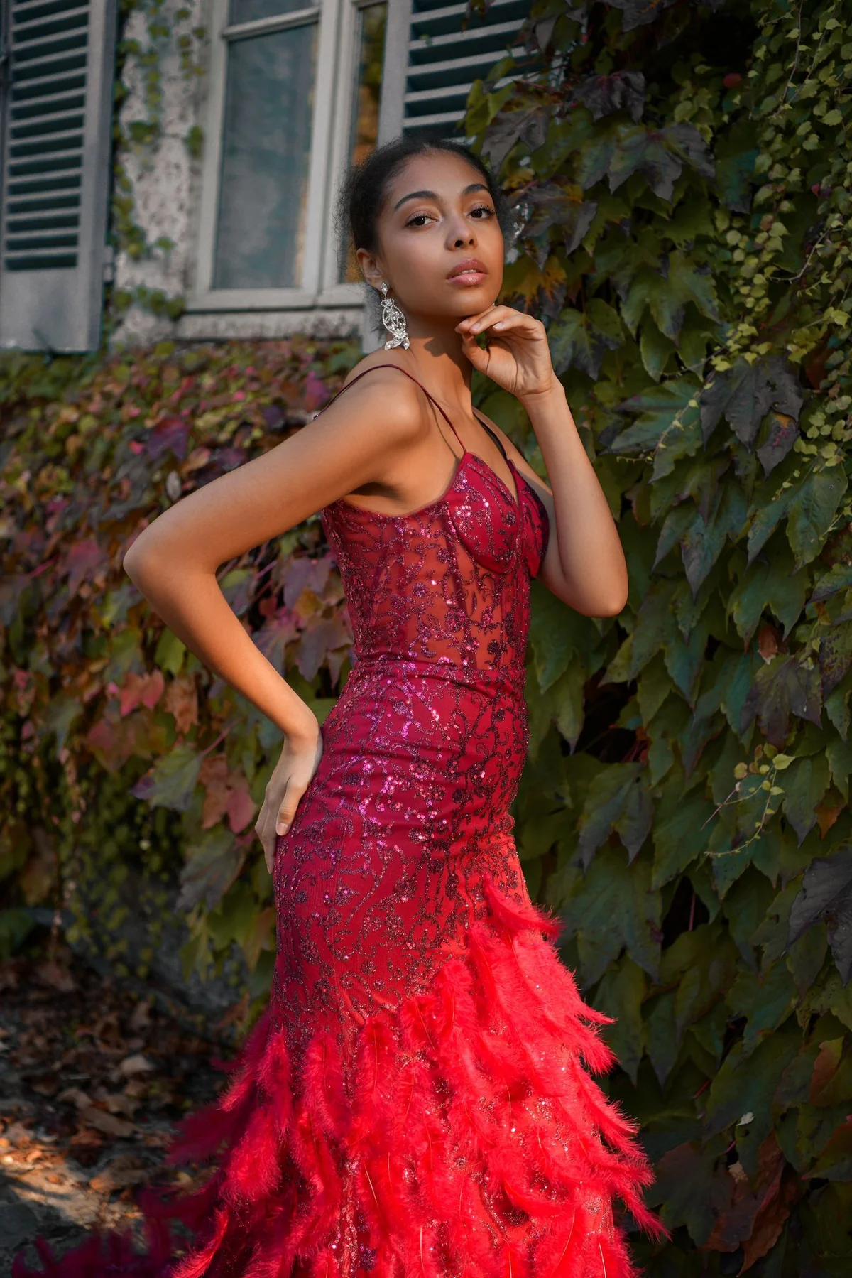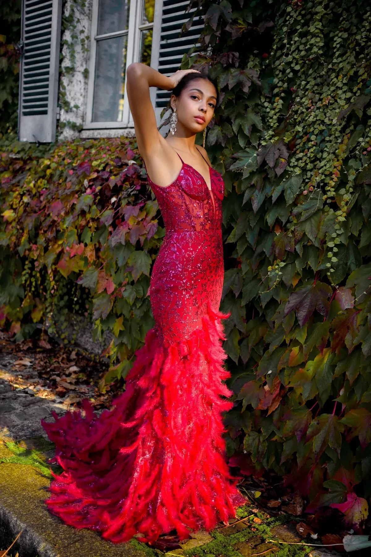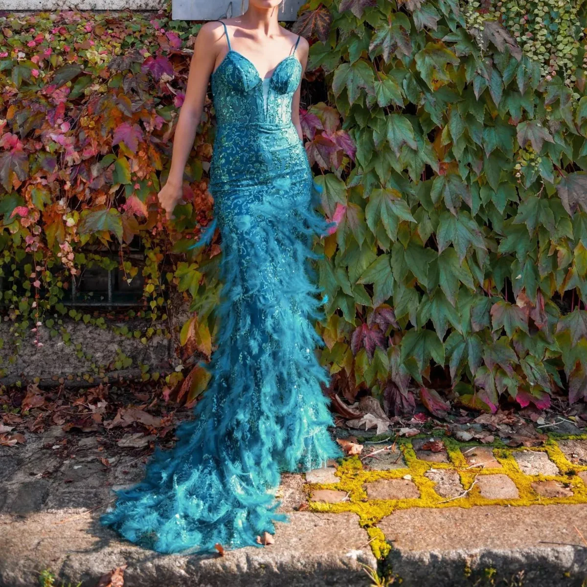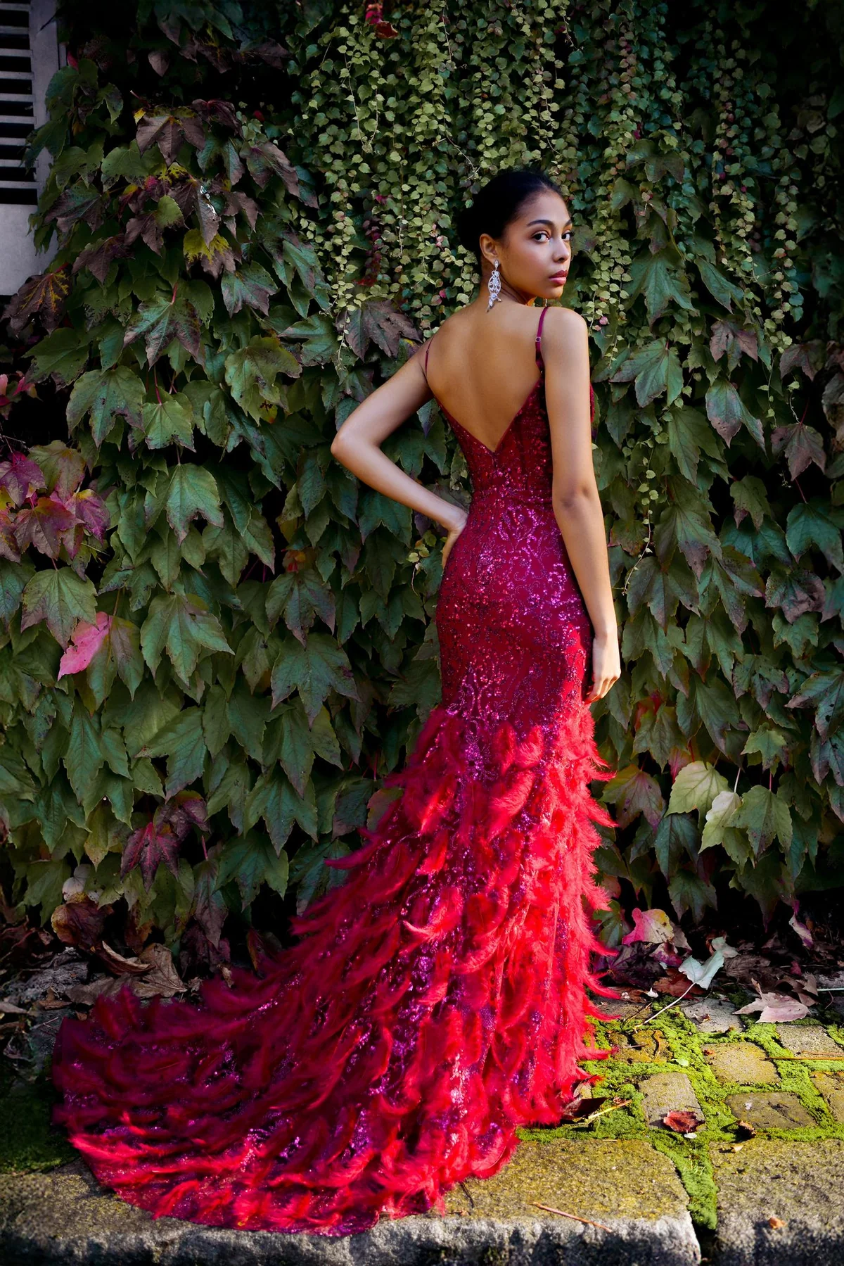 Vestido largo de purpuina con plumas en la parte inferior de la falda ideal para bodas, eventos, cocktails y todo tipo de celebraciones.